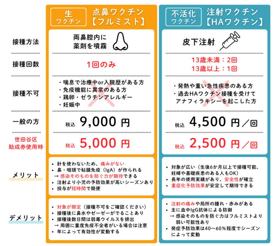 また、今年度は従来の皮下注射ワクチン【 HAワクチン 】に加えて、2〜18歳の方を対象に鼻から接種するインフルエンザワクチン【 フルミスト 】も接種可能となります。