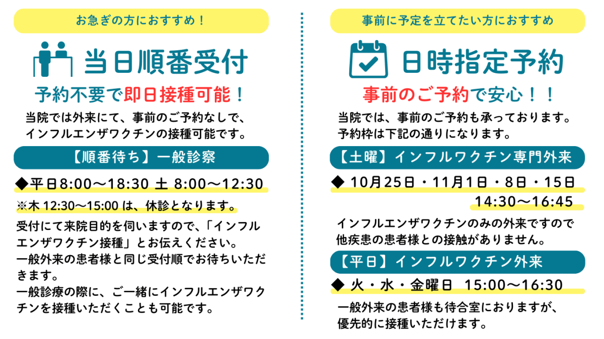 インフルエンザワクチン接種の受付方法は、「当日順番受付」と「日時指定予約」の2種類ございます。